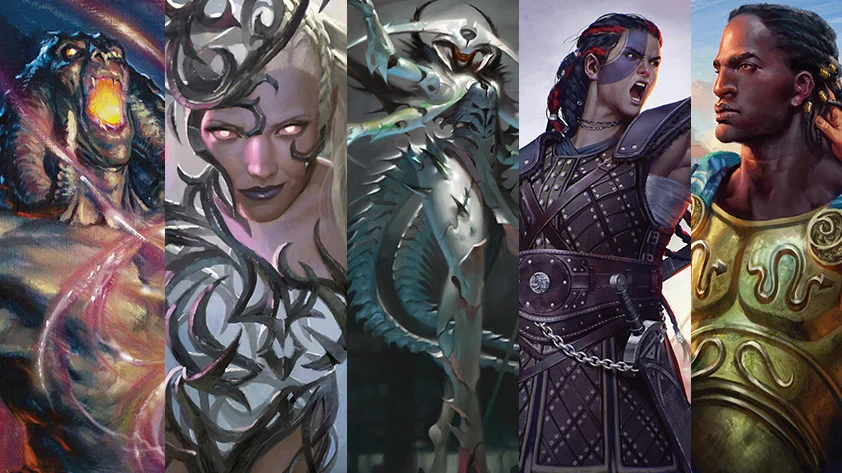 All of the featured legendary creatures in the set are brand new and getting cards for the very first time. They take players on a journey through the Multiverse of Magic: The Gathering to planes such as Dominaria, New Phyrexia, Theros, Innistrad, Tarkir, Zendikar, and the Reborn Alara as well as new and unnamed planes!